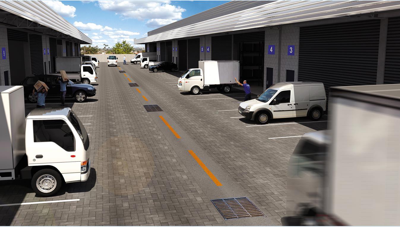 Outro grande diferencial é o fato de todas unidades serem servidas de um lado por fachadas comerciais com acesso direto à rua, e do outro por rua interna para acesso secundário ou carga e descarga, controlada por guarita blindada 24h.